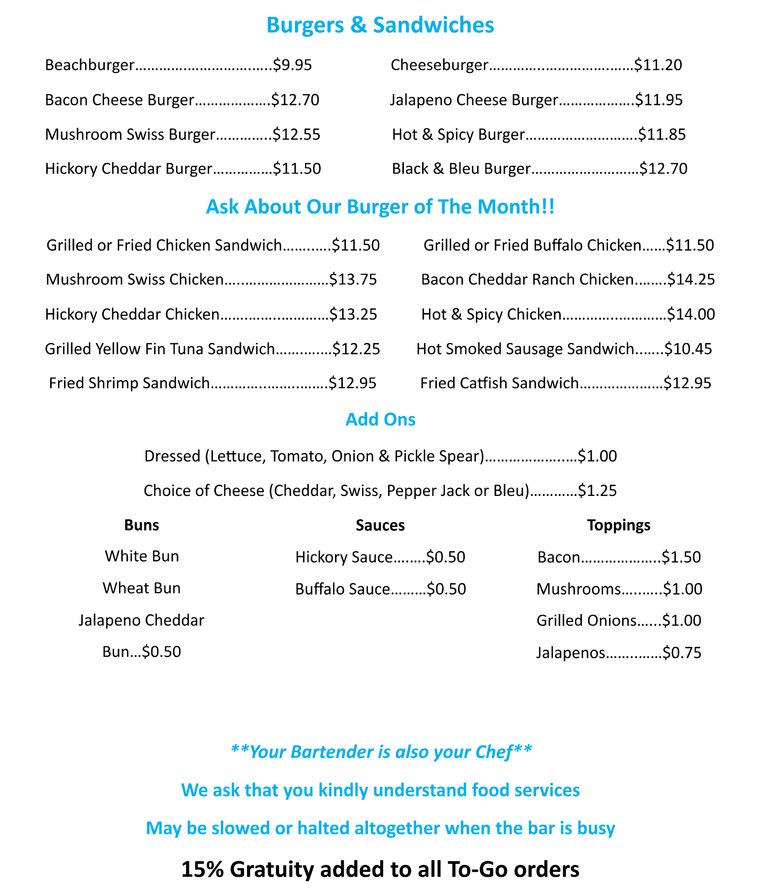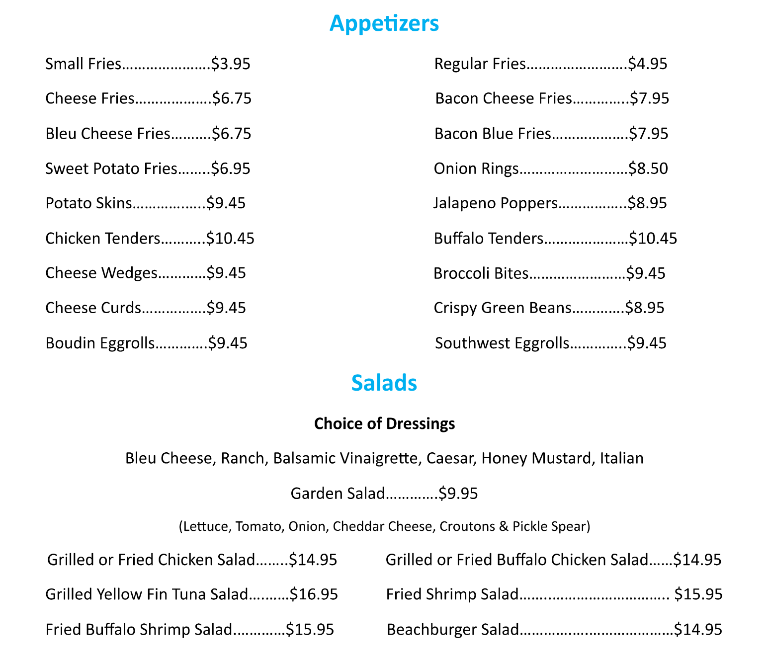 Beachcorner Bar and Grill is a Mid-City neighborhood sports bar that serves great food. Entertain yourself with darts, pool tables, and big screen TV’s. Catch a bite to eat before the big game or after with our LATE NIGHT GRILL, “Home of the 10oz Beachburger”. Our grill serves up all the perennial favorites from 11am till. Some popular appetizers we feature —- spicy meat pies, potato skins and mesquite chicken quesadilla rolls. A classic juicy 10oz ground chargrilled burger a with beer? What do you think of that? Well, this is a main attraction at the Beachcorner Bar & Grill. We serve up the best burger in town for a very small price. Besides the famous burgers, we have many other options. We serve an 8oz grilled tuna steak or an 8oz grilled chicken sandwich that come in many different combinations.